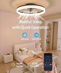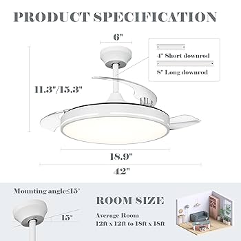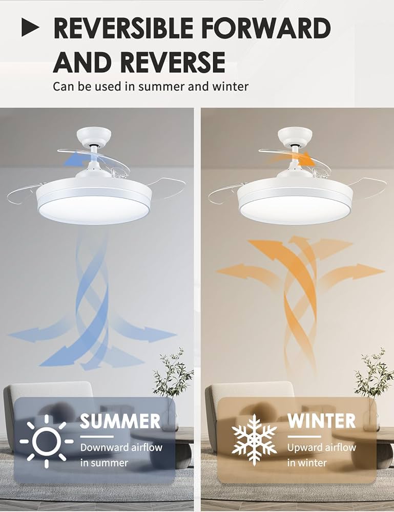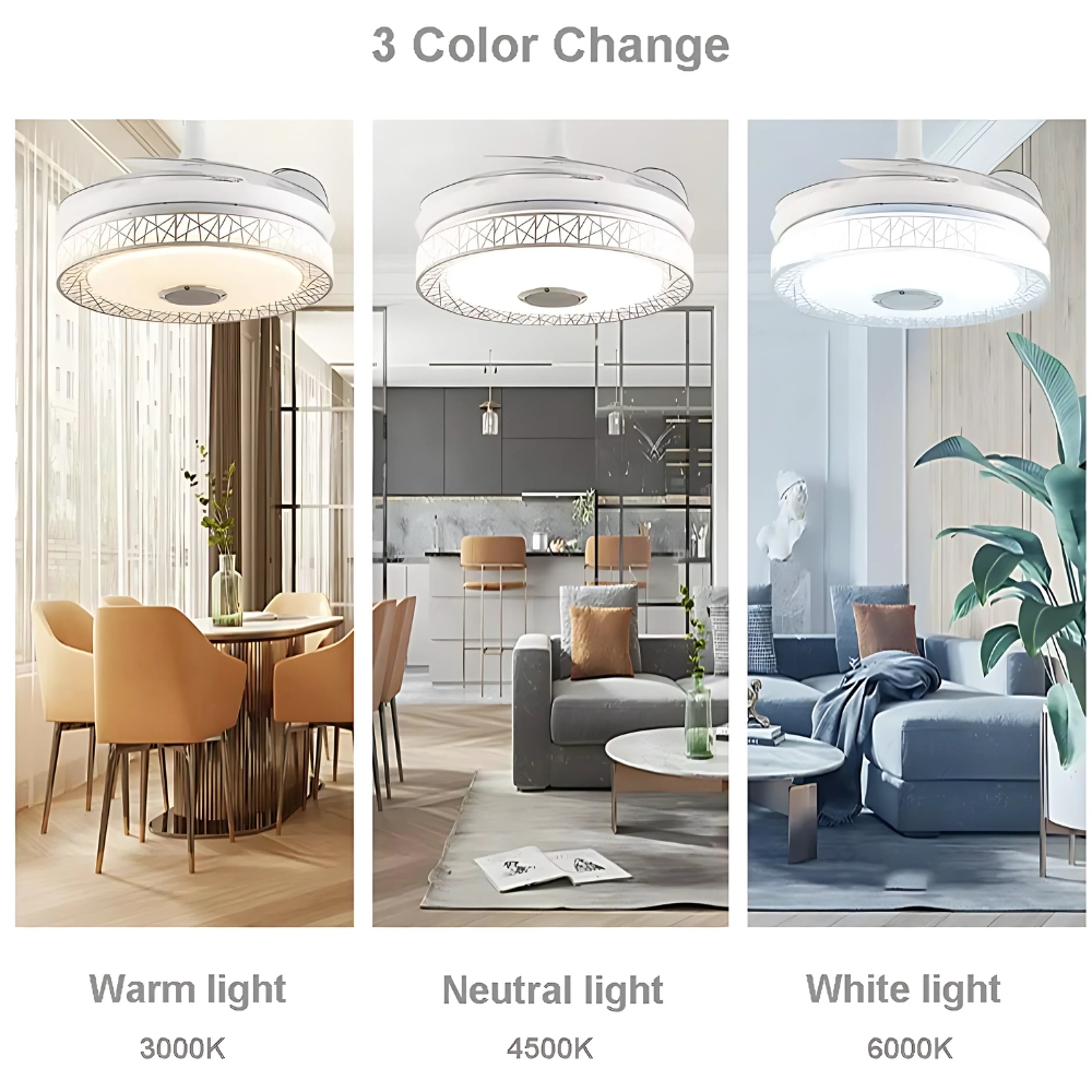CJOY LED invisible 4-blade ceiling fan with lighting and a remote control. It features retractable blades and a dimmable LED light with three color settings. The fan has six-speed settings and a timing function. The fan blades are made of ABS, and the light body is made of metal. The fan is designed for quiet operation.